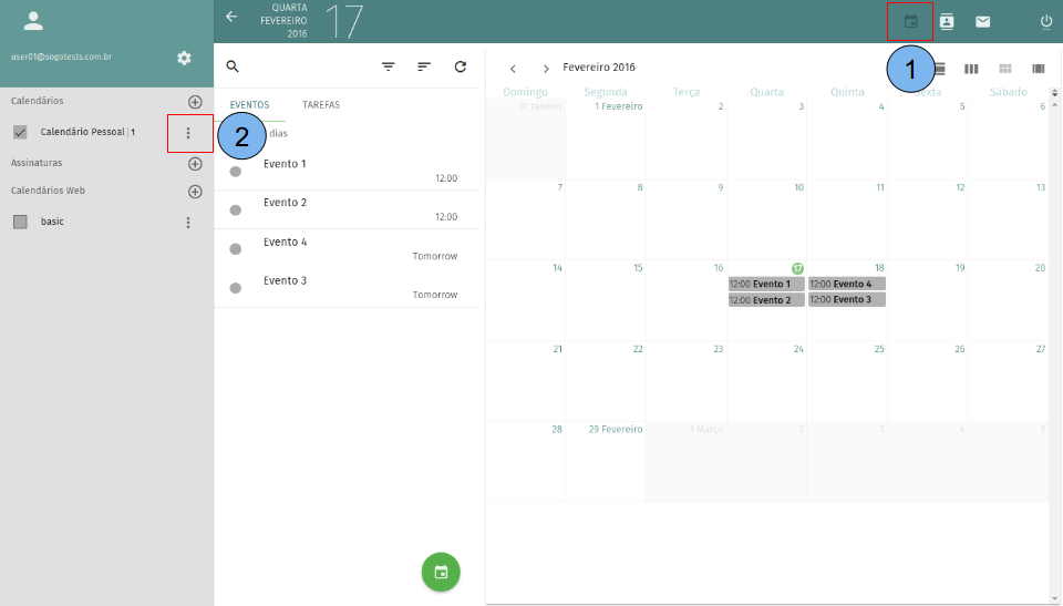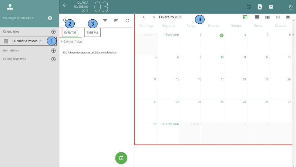 Na página inicial do calendário temos: (1)O Calendário Pessoal que já vem por padrão do sistema. (2)Eventos. (3)Tarefas. (4)Exibição do calendário selecionado no passo (1).