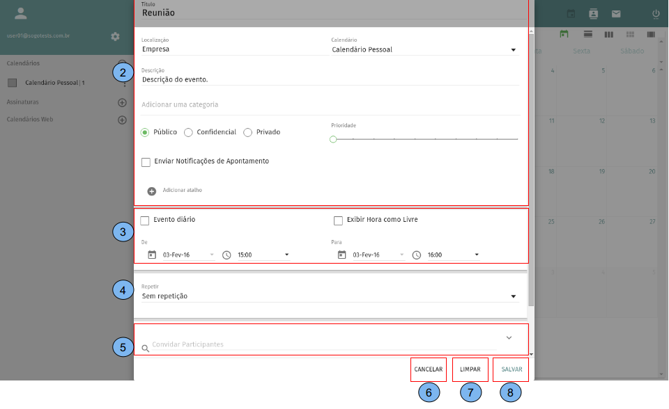 (2)Informações gerais sobre o evento (3)Informações sobre data, horário e duração do evento (4)Configuração sobre repetição do evento. (5)Convidar participantes para o evento. (6)Botão para cancelar a criação do evento. (7)Caso seja necessário limpe todos os campos digitados. (8)Salvar o evento.