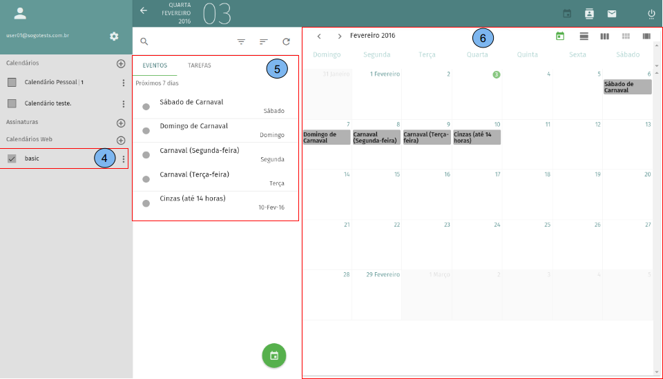 (4) Calendário da Web criado. (5) Exibição do resumo dos eventos do mês. (6) Exibição dos eventos no calendário