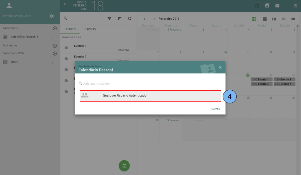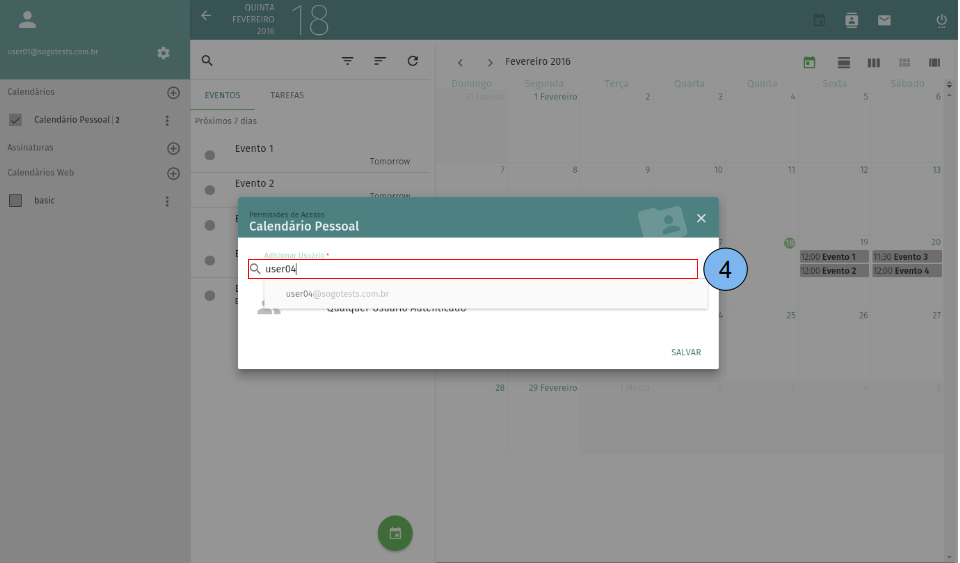 (4) Você pode começar a digitar o endereço de e-mail com quem o calendário será compartilhado. (5) Selecione na listagem o e-mail com quem o calendário será compartilhado.