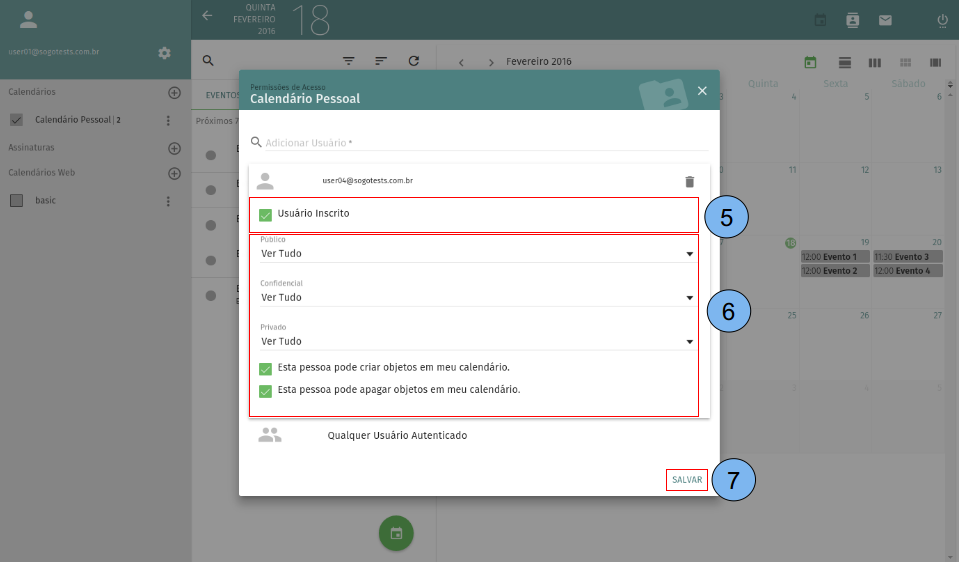 (5) Marque a opção “Usuário inscrito”. (6) Defina as permissões que esse usuário terá sobre o seu calendário. (7) Clique em “Salvar”.