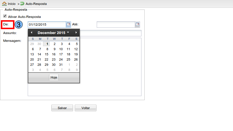 Selecione a data de início para envio da auto resposta na opção “De” (3)
