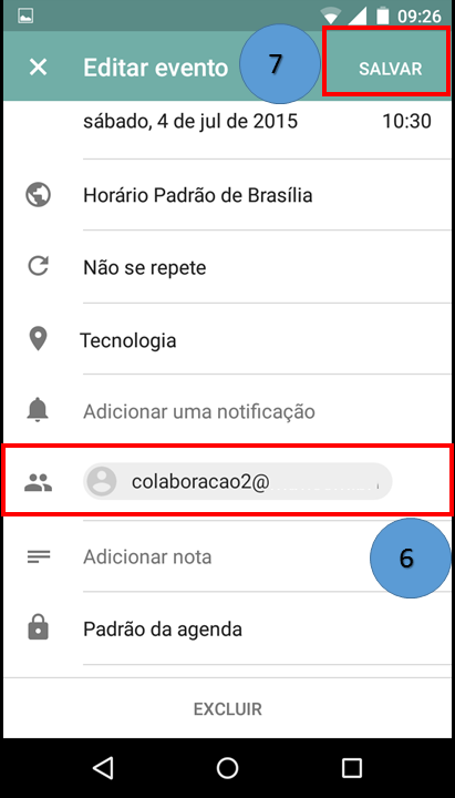 Na tela abaixo serão apresentados os convidados para o evento (6), para concluir clique em “Salvar” (7).