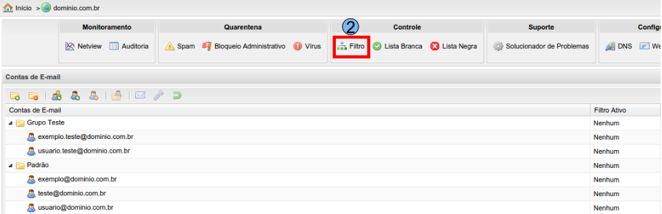 Na opção “Filtro Ativo” (3), localize e selecione o filtro que deseja atribuir para o domínio, neste caso iremos utilizar o filtro “Nome do Filtro” (4).