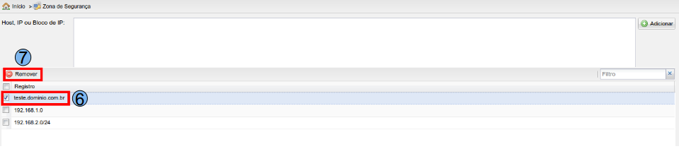 Caso precise retirar a permissão de envio de checagem de um Host, IP ou Bloco de IP, basta selecionar o registro (6) e em seguida clicar em “Remover” (7), a opção removida não terá mais permissão para enviar e checar seus e-mails fora da Zona de Segurança do domínio.