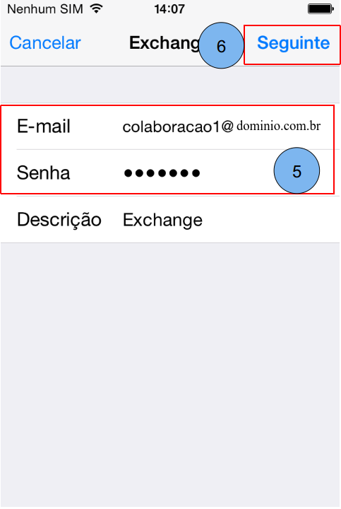 Na próxima tela preencha os dados da conta (E-mail e senha) (5) e depois clique em “Seguinte”(6).
