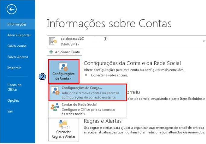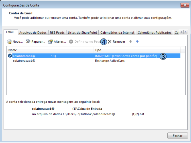 Em seguida utilize a opção “Configurações de Conta” e em seguida “Configurações de Conta” novamente (2) Na próxima tela, seleciona a conta do tipo IMAP/SMTP (3) e clique em “Remover” (4).