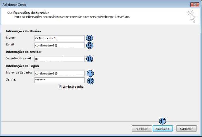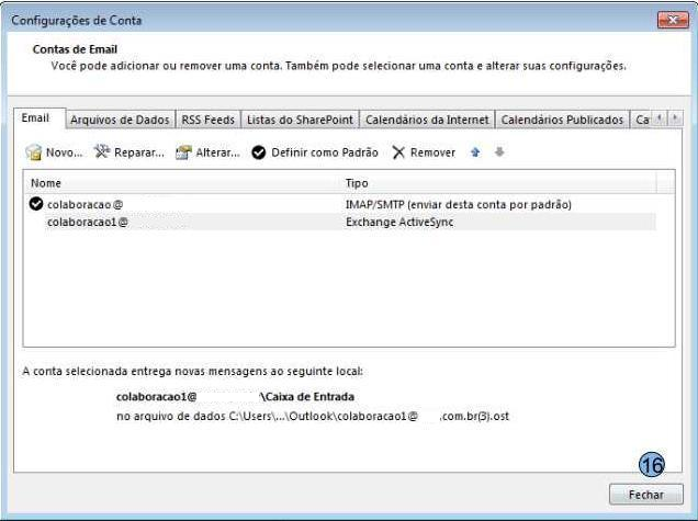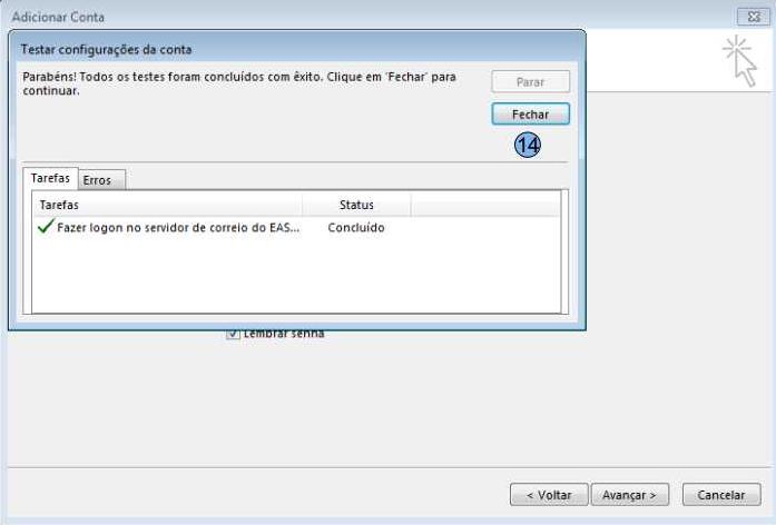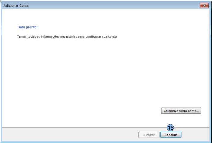(8) Nome de exibição da conta (9) E-mail do usuário (10) Servidor de e-mail, sempre utilizar o padrão: m.dominio.com.br (11) Repetir o e-mail do usuário, idêntico a informação (9) (12) Senha do usuário (13) Em seguida clicar em “Avançar” Caso o login seja efetuado com sucesso a tela abaixo será exibida. Podemos então cliente em no botão “Fechar” (14) e em seguida “Concluir” (15) e novamente em “Fechar” (16)