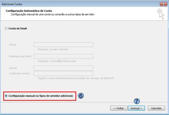 Em seguida utiliza a opção “Configuração manual ou tipos de servidor adicionais” (6) e em depois “Avançar”