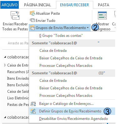 Para utilizar a novo formato de colaboração, não há Suporte para contas que estão configuradas como POP nos clientes de e-mails, sendo então necessário uma nova configuração. Recomendamos então que mesmo utilizando o procedimento abaixo, um backup da informações seja realizado com a finalidade de prevenir qualquer perda de informação. Primeiramente, realize a configuração novamente da conta seguindo as orientações do item 3.1. Em seguida vamos desabilitar o envio e recebimento de e-mails através dessa conta, lembrando que a mesma não deve ser excluída, pois os e-mails são armazenados localmente com a utilização do protocolo POP. Clique na opção “ENVIAR/RECEBER” (1) Selecione em seguida “Grupos de Envio/Recebimento” (2) e em seguida “Definir Grupos de Envio/Recebimento” (3)