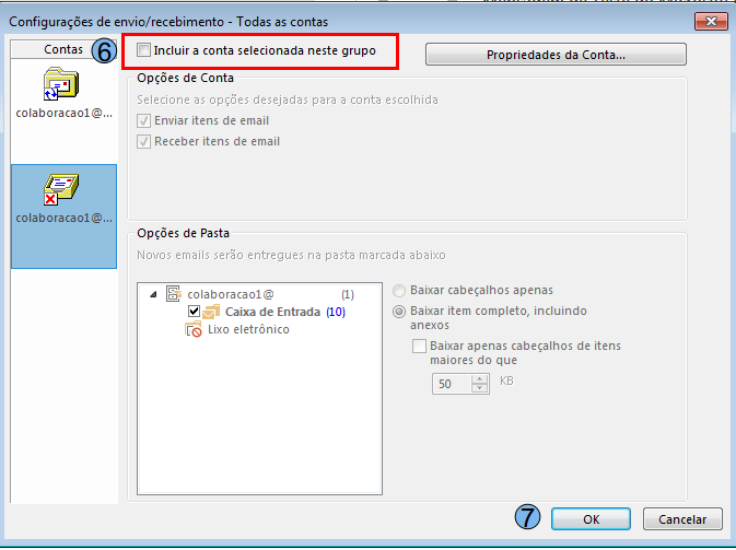 Desmarque a opção “Incluir a conta selecionada neste grupo” (6) e clique em “OK” (7)