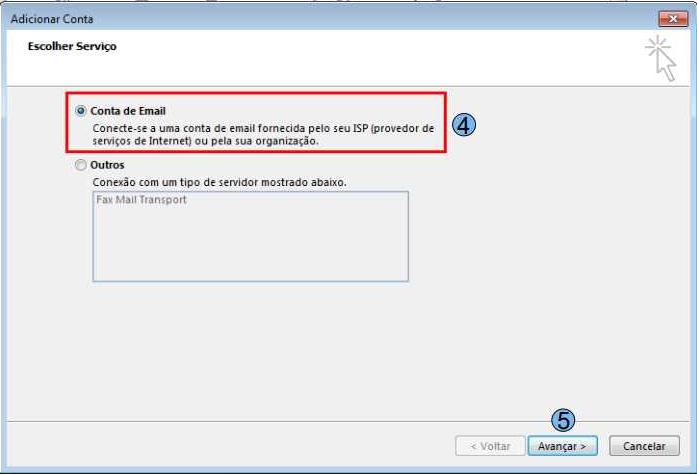 Selecione a opção “Conta de Email” (4) e “Avançar” (5)