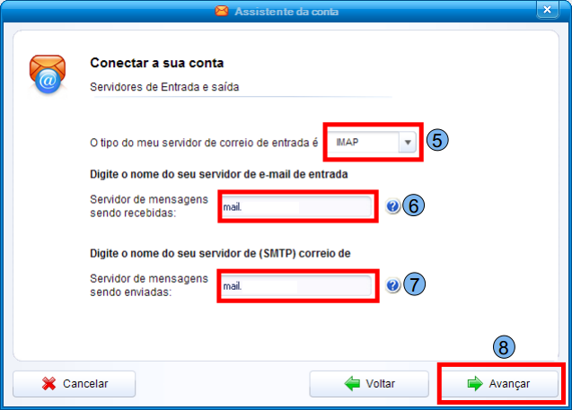 Em “Tipo do meu servidor de correio de entrada é” (5), selecione “IMAP”. Na opção “Servidor de mensagens sendo recebidas” (6), digite o endereço do servidor de acordo com o domínio, em “Servidor de mensagens sendo enviadas” (7), digite o endereço do servidor de acordo com o domínio e em seguida clique em “Avançar” (8).