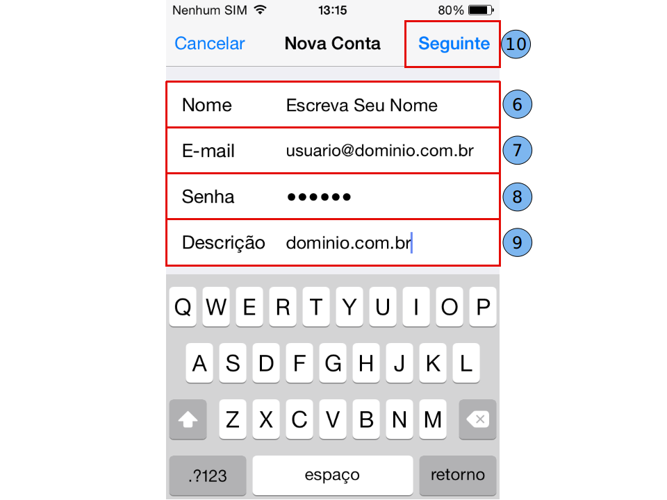 Endereço (7): digite o endereço completo do seu e-mail.