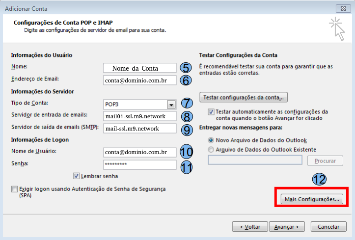 Nome (5), digite o nome para exibição Endereço de Email (6), digite seu endereço de e-mail Tipo de Conta (7), escolha a opção POP3 Servidor de entrada de e-mails (8), digite o endereço de acordo com seu domínio, exemplo: mail01-ssl.m9.network Servidor de saída de e-mails (9), digite o endereço de acordo com seu domínio, exemplo: mail-ssl.m9.network Nome de usuário (10), digite seu endereço de e-mail Senha (11), digite a senha do seu e-mail Após preencher os campos acima, clique na opção Mais configurações (12)