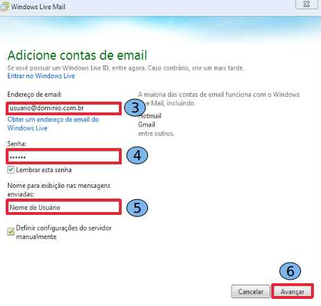 Na próxima Janela, preencha os campos: Conta de e-mail (3) usuário@dominio.com.br, a “Senha” (4) da conta, “Nome do Usuário” (5) e habilite a opção “Definir configurações do servidor manualmente” e clique em “Avançar” (6).
