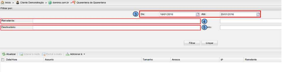“Atualizar” (10) - para atualizar a página atual clique na opção Atualizar. “Liberar e-mails” (11) - É utilizado quando uma mensagem é barrada na “Quarentena de Vírus” e é necessário que e a mesma seja entregue na caixa postal. “Excluir E-mail” (12) - Caso queira remover a mensagem antes de 14 dias clique em Excluir E-mail. “Adicionar à:” (13) - Será exibida as opções “Lista branca”, “Lista Negra”. Selecione um e-mail que contém o corpo da mensagem na auditoria e clique em “Adicionar à:”, clicando ambas as opções é possível adicionar o “E-mail”, “Domínio” “IP” do remetente na “Lista branca” Ou “Lista Negra”.