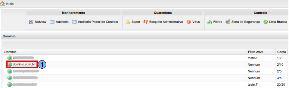 Para iniciar o processo de visualização do relatório de tráfego diário de e-mails, na tela inicial do Painel de Controle, localize o domínio desejado, neste caso, será utilizado “domínio.com.br” (1), clique duas vezes sobre o mesmo.