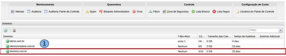 Após acessar o Painel de Controle http://painel.dominiodehospedagem.com.br/ siga os procedimentos: Ao acessar a “Página Inicial” do painel de controle, dê um duplo clique no domínio “dominio.com.br” (1)